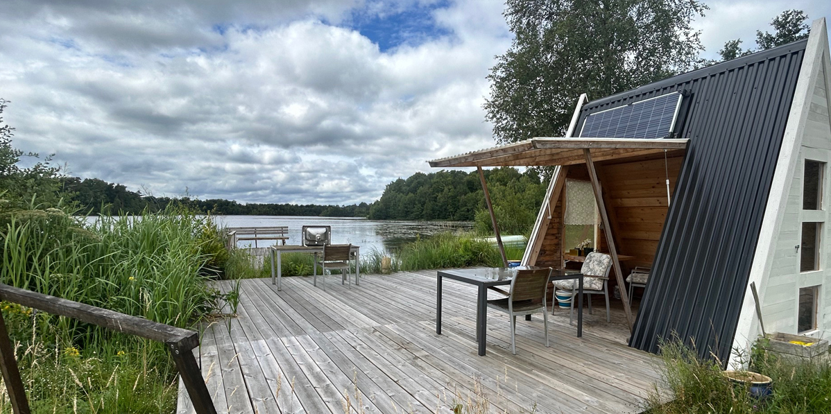 I trädgården är det många projekt på gång, nyplanterade fruktträd och ett lusthus under byggnation. Nere vid sjön har Michael byggt en fantastisk uteplats där paret kan njuta av utsikten och de goda energierna från sjön.