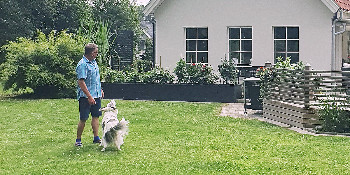 Efter en bomässa 2004 köpte Ola och Silvia inte bara en, utan tre mindre tomter och slog ihop dem till en stor tomt. Där byggde de precis det huset de ville ha, med ett ordentligt garage och förråd. Silvia älskar sitt stora växthus och hundarna älskar den stora gräsmattan som de springer runt på.