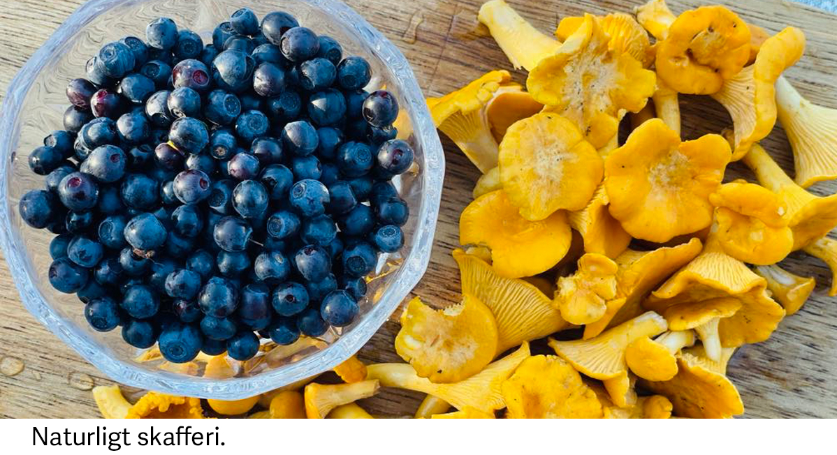 Några minuter från din dörr kan du njuta av naturens gåvor i form av bär och svamp, där de fuktiga prunkande gröna markerna gör svampen just extra frodig och god. Från midsommar till de första frostnätterna kan man ge sig ut på kantarelljakt. Skogssmultron och vilda hallon kantar grusvägarna och blåbärsrisen bidrar till hemmabakad paj.
